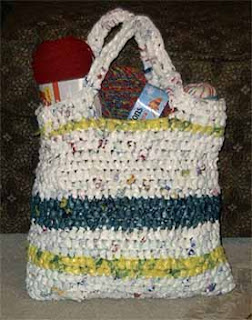 The navy ball and yellow ball are both old t-shirts of mine... the white ball is plastic grocery bags and the front ball is newspaper!! I'm going to make a crocheted rug with the t-shirt yarn ("t-sharn") -- I'm seeing primary colors... maybe to add some color to the guest room. The plastic bag yarn ("plarn") I'll make a tote bag out of, here's an example: